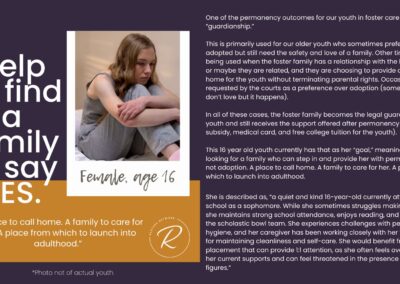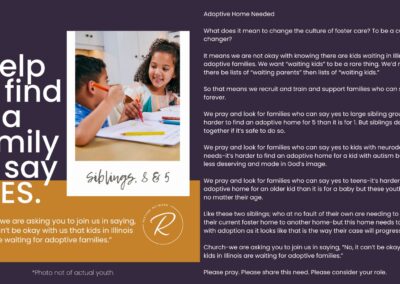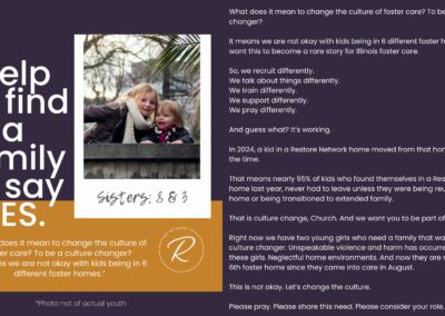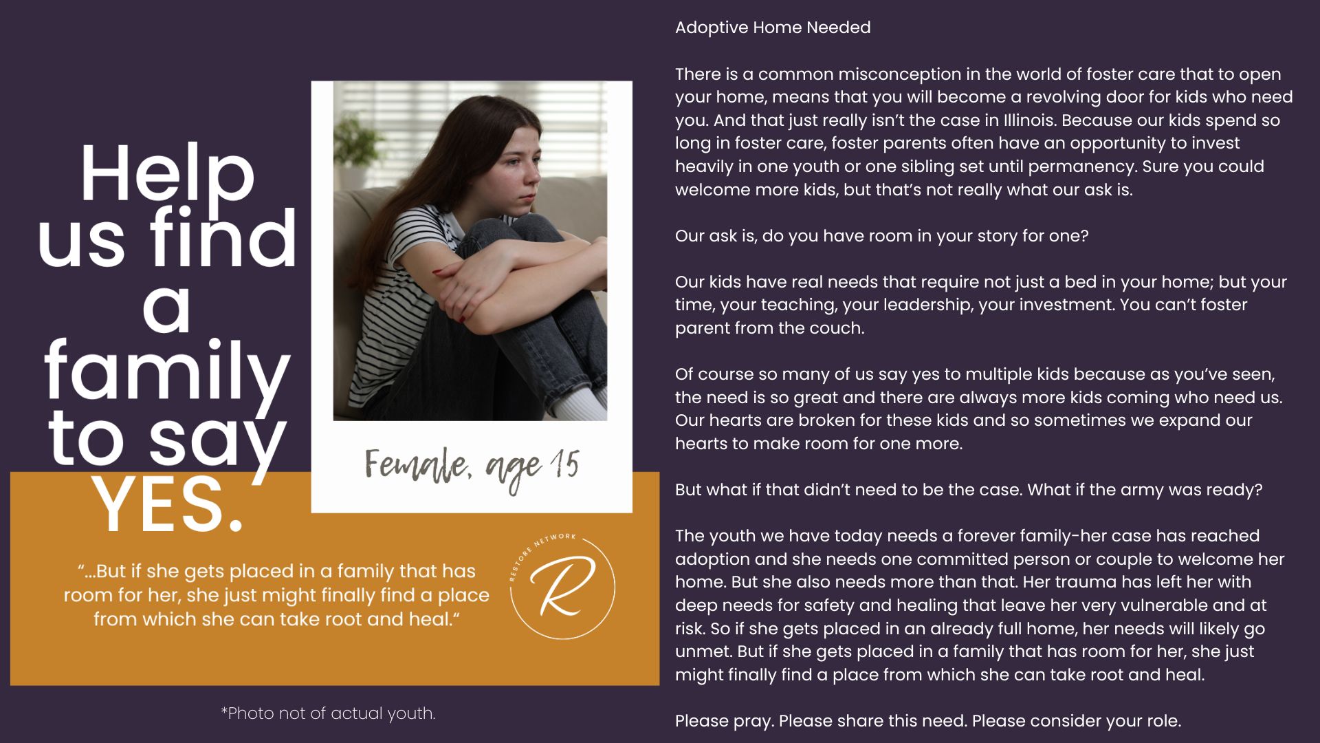 The below stories have been written using the information shared with us from our child welfare partners when they cannot find a home for a youth in their care. The narratives are based on real stories of the hard our youth in foster care face using nonidentifying information to protect them. Every week you’ll find new stories posted here as the needs of more kids in Illinois become known to us. May we be a people who respond.
