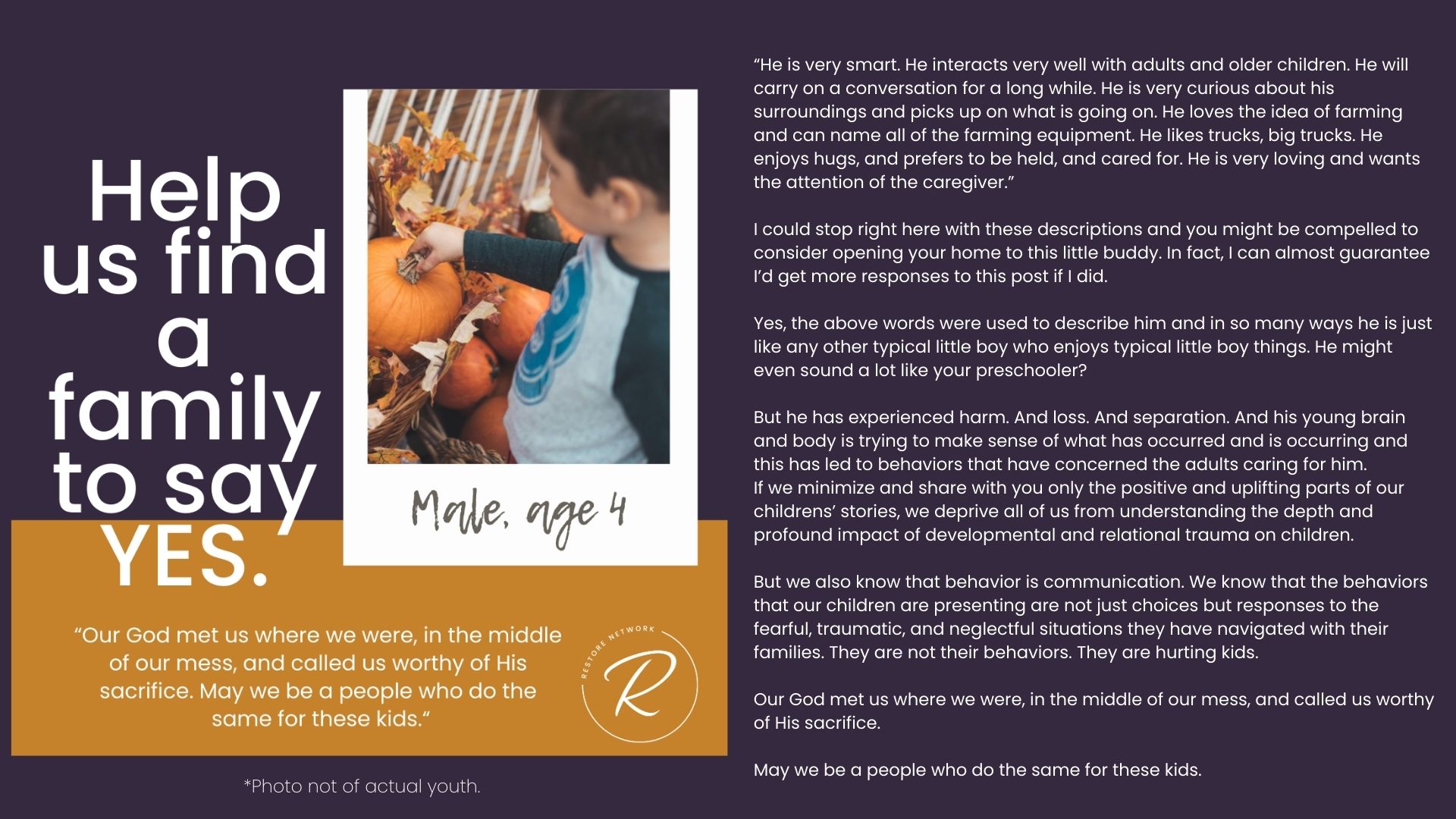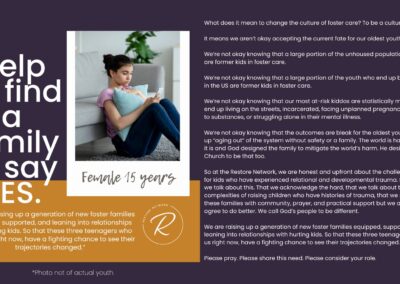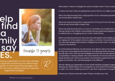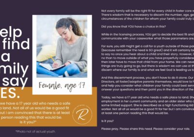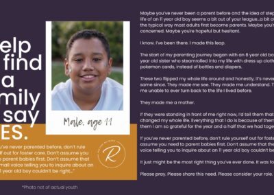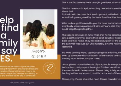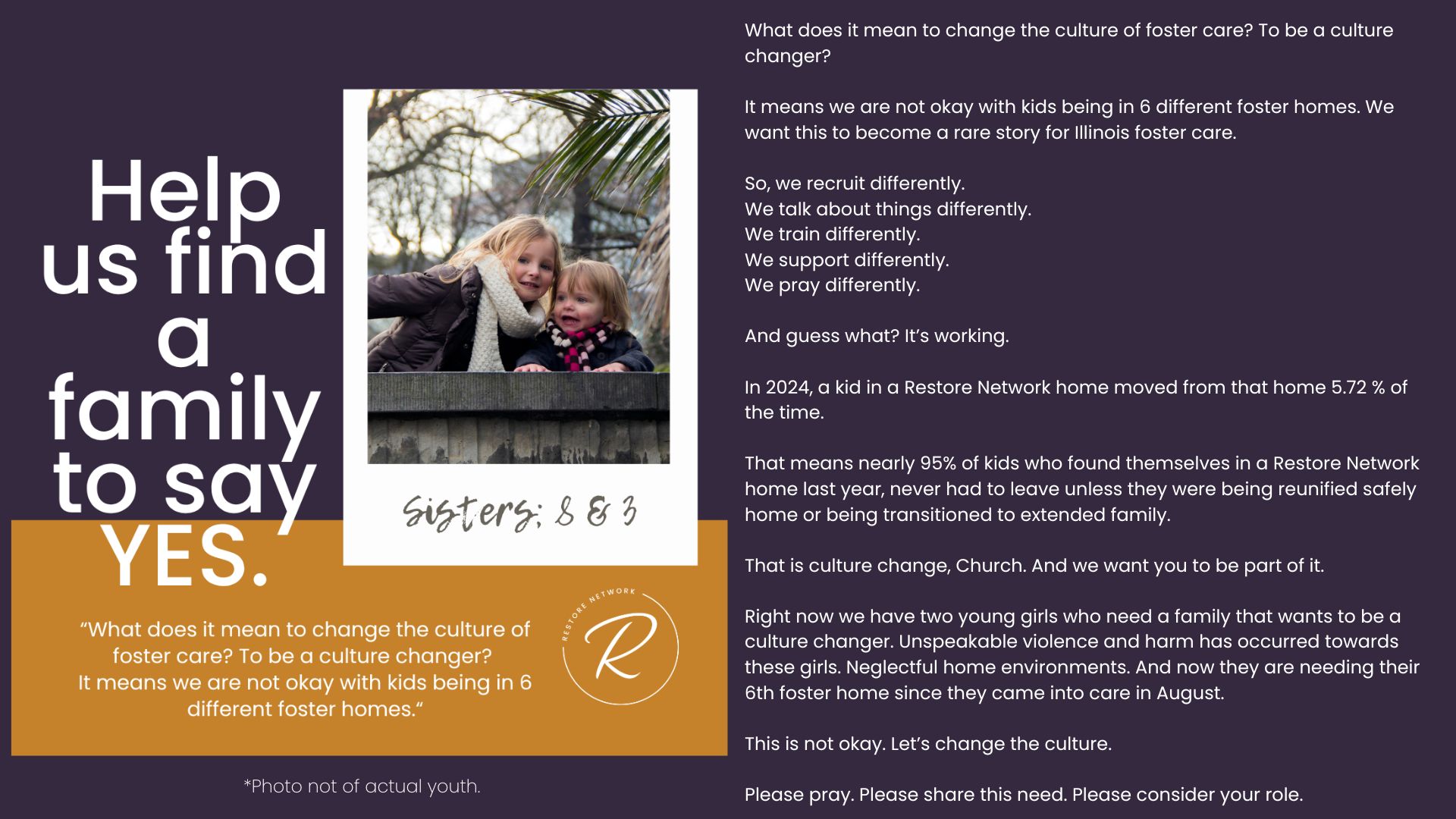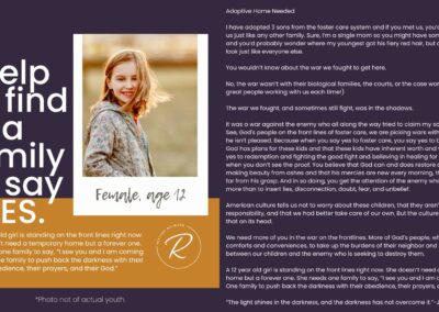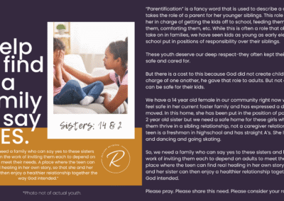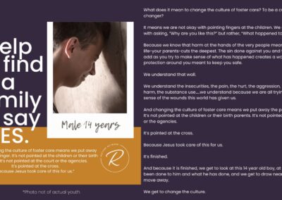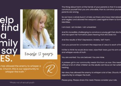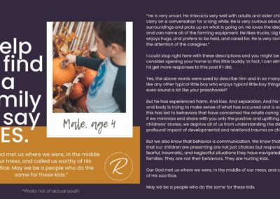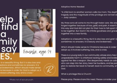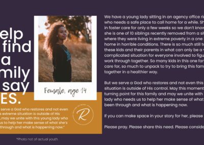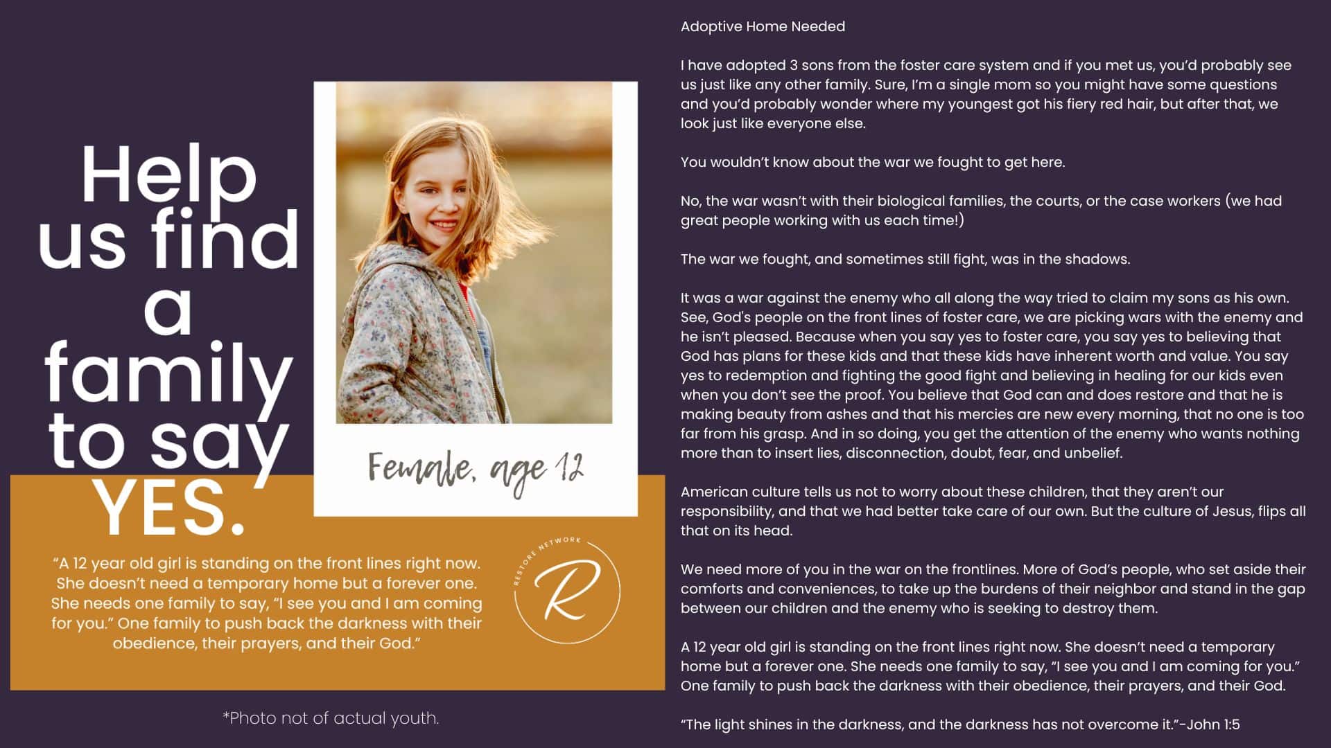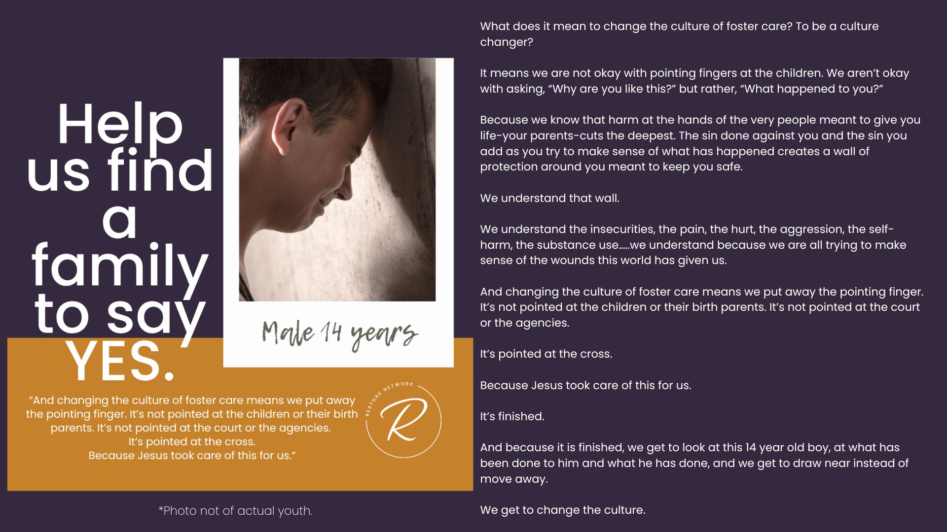 The children we serve are incredibly vulnerable and we have fiercely chosen to protect them over the years by guarding their identities and their stories. But we also want you to know them and to be moved by the stories of real kids in your county who need you. Over the years, we have attempted ways to allow you behind the curtain; to be confronted by the specific number and depth of needs of the children in our community. We’ve brought you statistics, we’ve asked for prayers when new kids have joined our homes, we’ve celebrated adoptions and reunifications with you, and we’ve been honest about the number of kids who need us and the limited number of homes we have available for them.