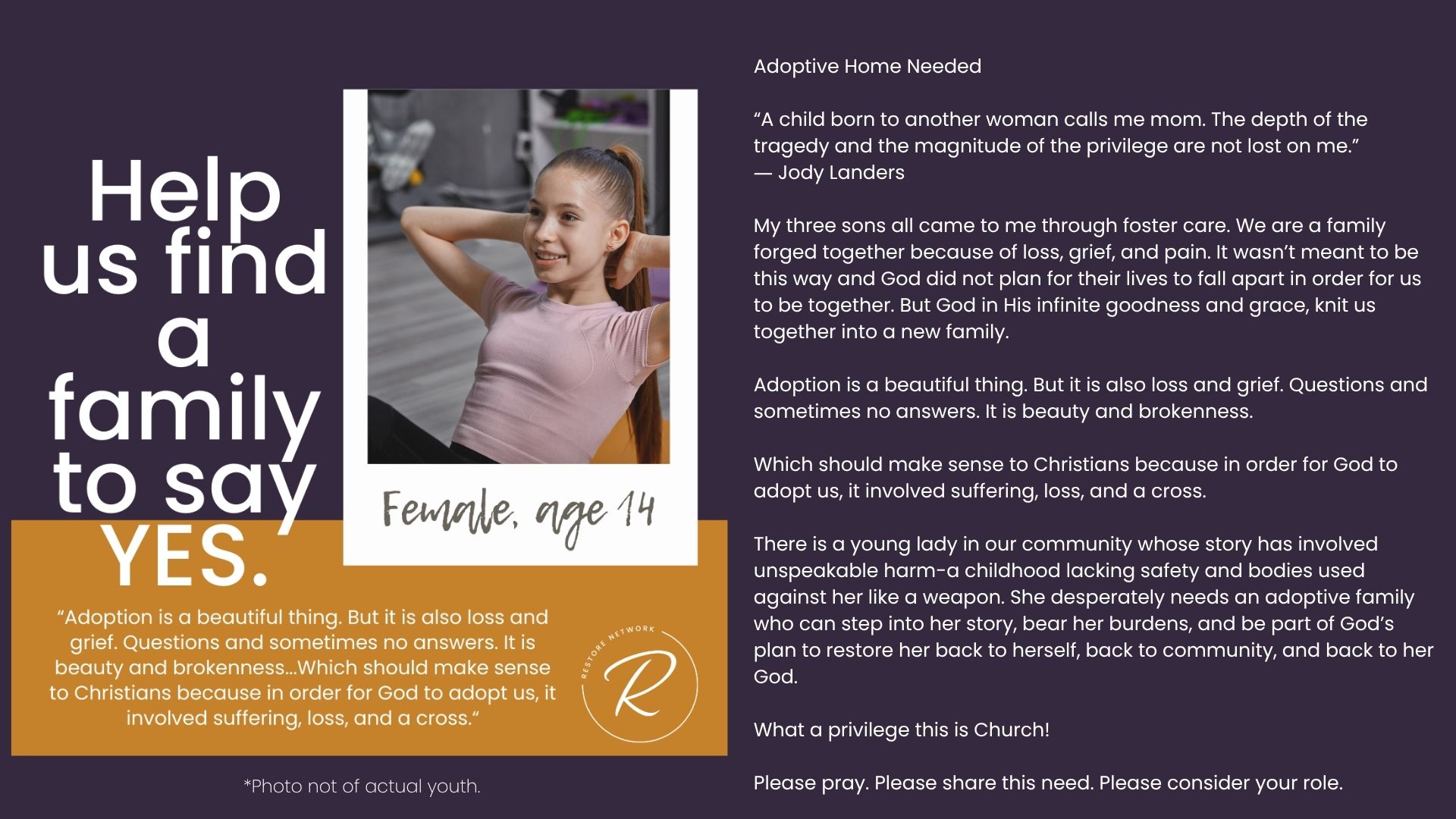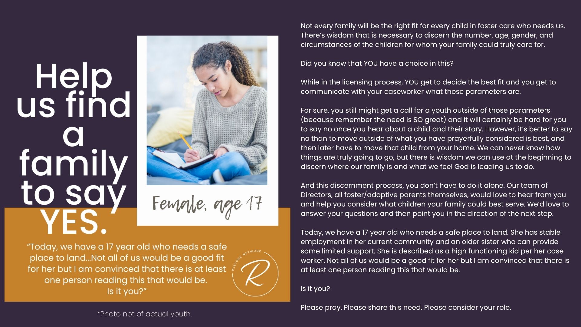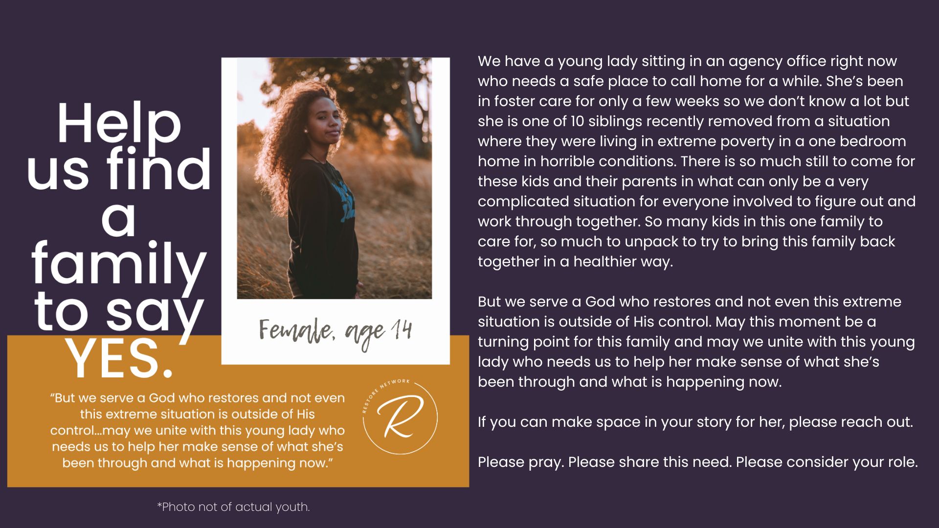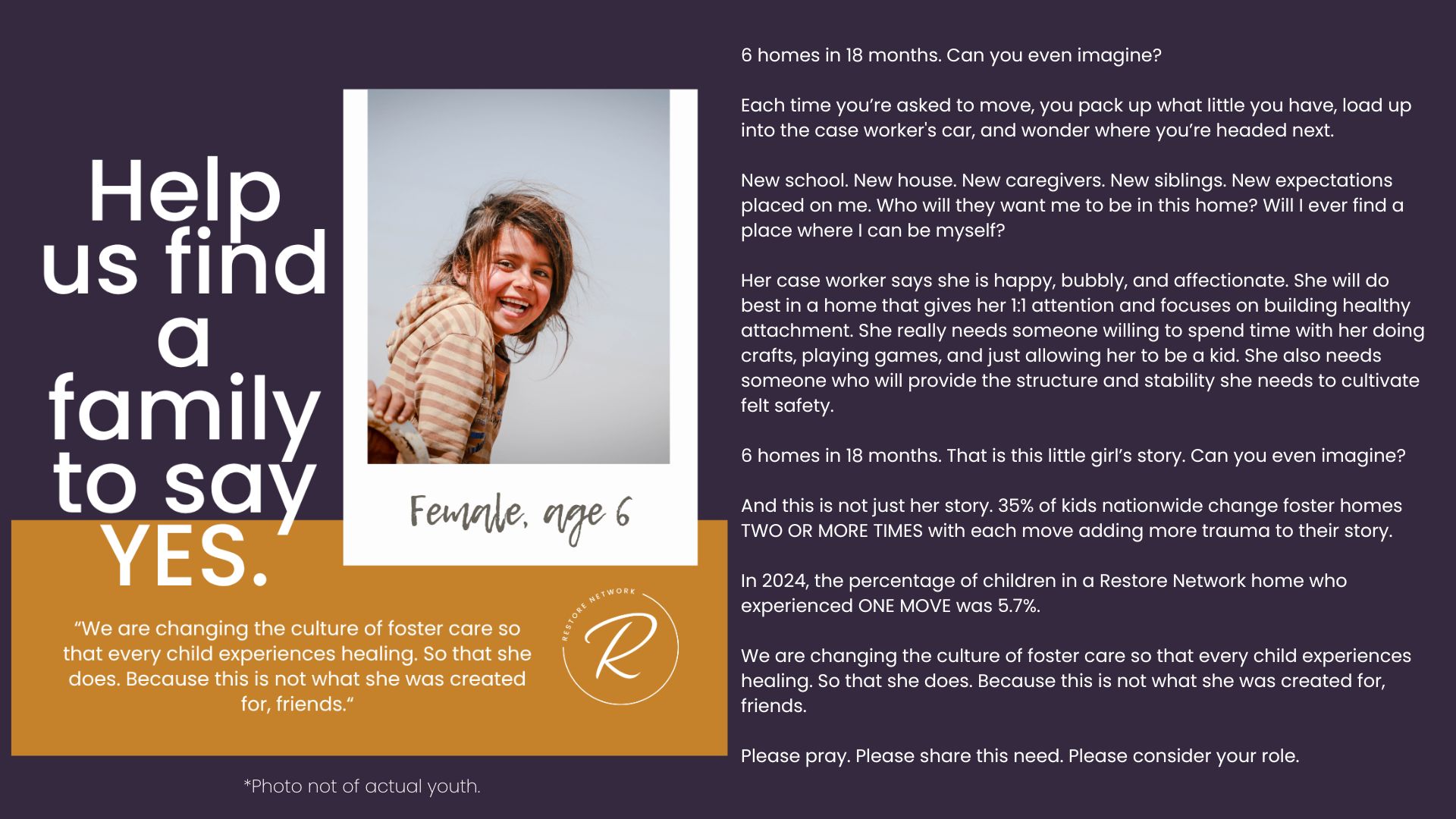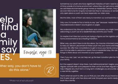 The children we serve are incredibly vulnerable and we have fiercely chosen to protect them over the years by guarding their identities and their stories. But we also want you to know them and to be moved by the stories of real kids in your county who need you. Over the years, we have attempted ways to allow you behind the curtain; to be confronted by the specific number and depth of needs of the children in our community. We’ve brought you statistics, we’ve asked for prayers when new kids have joined our homes, we’ve celebrated adoptions and reunifications with you, and we’ve been honest about the number of kids who need us and the limited number of homes we have available for them.