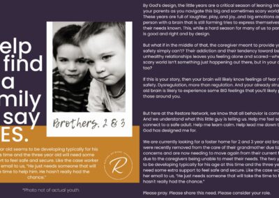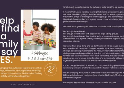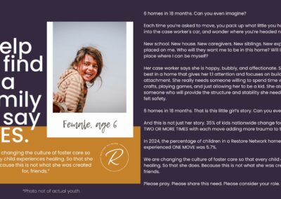 Restore Network Community-We know that you care about our kids. We know because we have had the privilege of a front row seat to your years of generosity in financial gifts, volunteer hours and the meeting of a variety of tangible needs. You are a blessing to the work we do, which ultimately means you are a blessing to countless children and families within our communities. We simply don’t exist without you. You are the Restore Network.